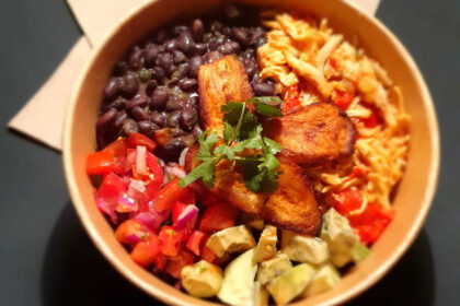 Manzo sfilacciato cotto a bassa temperatura, fagioli neri sfusi, insalata pomodori, cipolla di Tropea e coriandolo, Avocado, platano fritto.